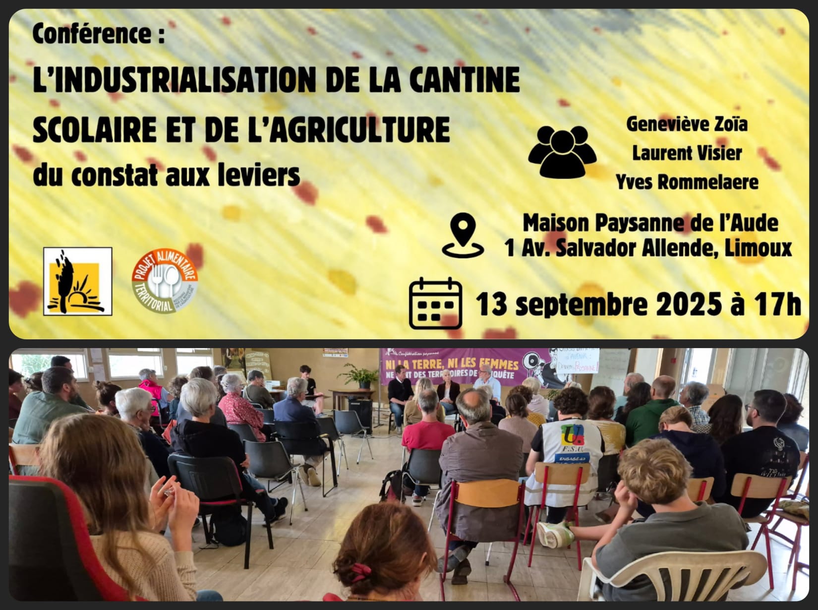 Le jeudi 31 mars 2022, Nature et Progrès organise une projection à la Maison Paysanne de l'Aude du documentaire Zéro Phyto 100% bio qui met en avant plusieurs communes de France qui ont fait le pari de stopper l'utilisation de pesticides et d'approvisionner leur cantine en produits bio.